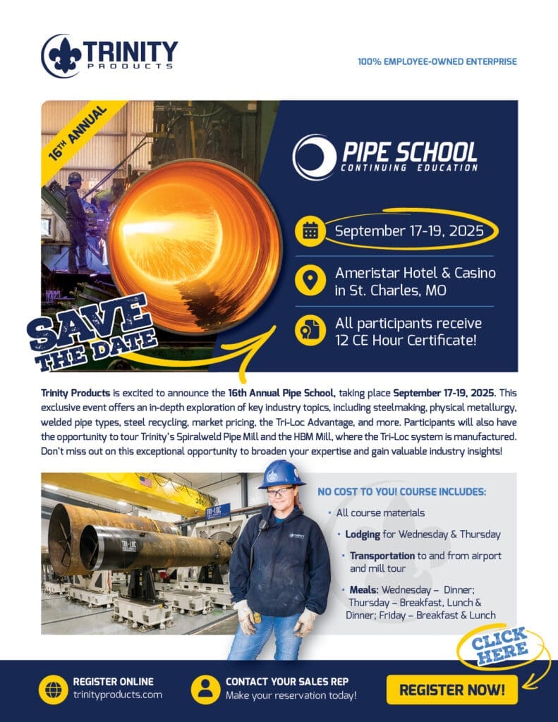 Before touring Trinity’s state-of-the-art Steel Pipe Mill and Horizontal Boring Mill (HBM), attendees will receive a brief but important safety orientation outlining site protocols, required PPE, and emergency procedures. The guided tour will offer an up-close look at the steel pipe manufacturing process—from raw material to finished product—as well as the precision machining capabilities of the HBM facility. This behind-the-scenes experience highlights Trinity’s commitment to safety, innovation, and quality in heavy steel fabrication.